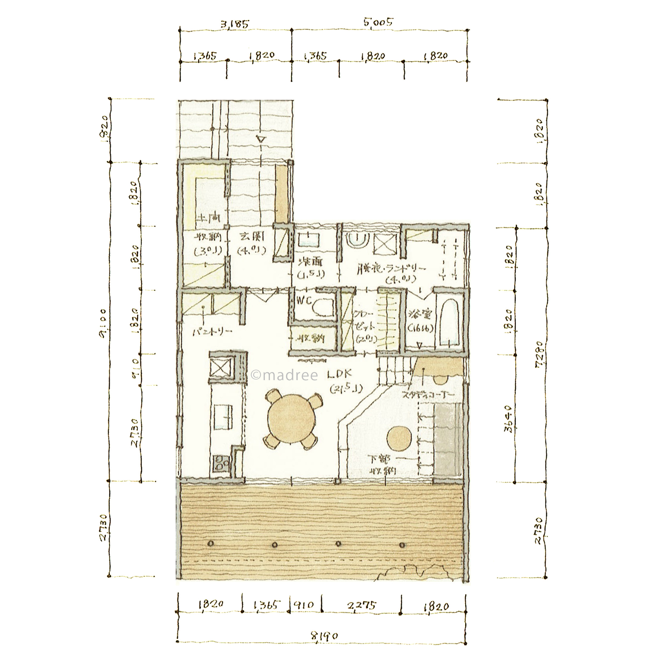 全国の建築家から間取りが集まるmadree(マドリー)で集まった35坪、2LDKの間取りです。オープンキッチンやペニンシュラキッチンが特徴の注文住宅の間取りです。