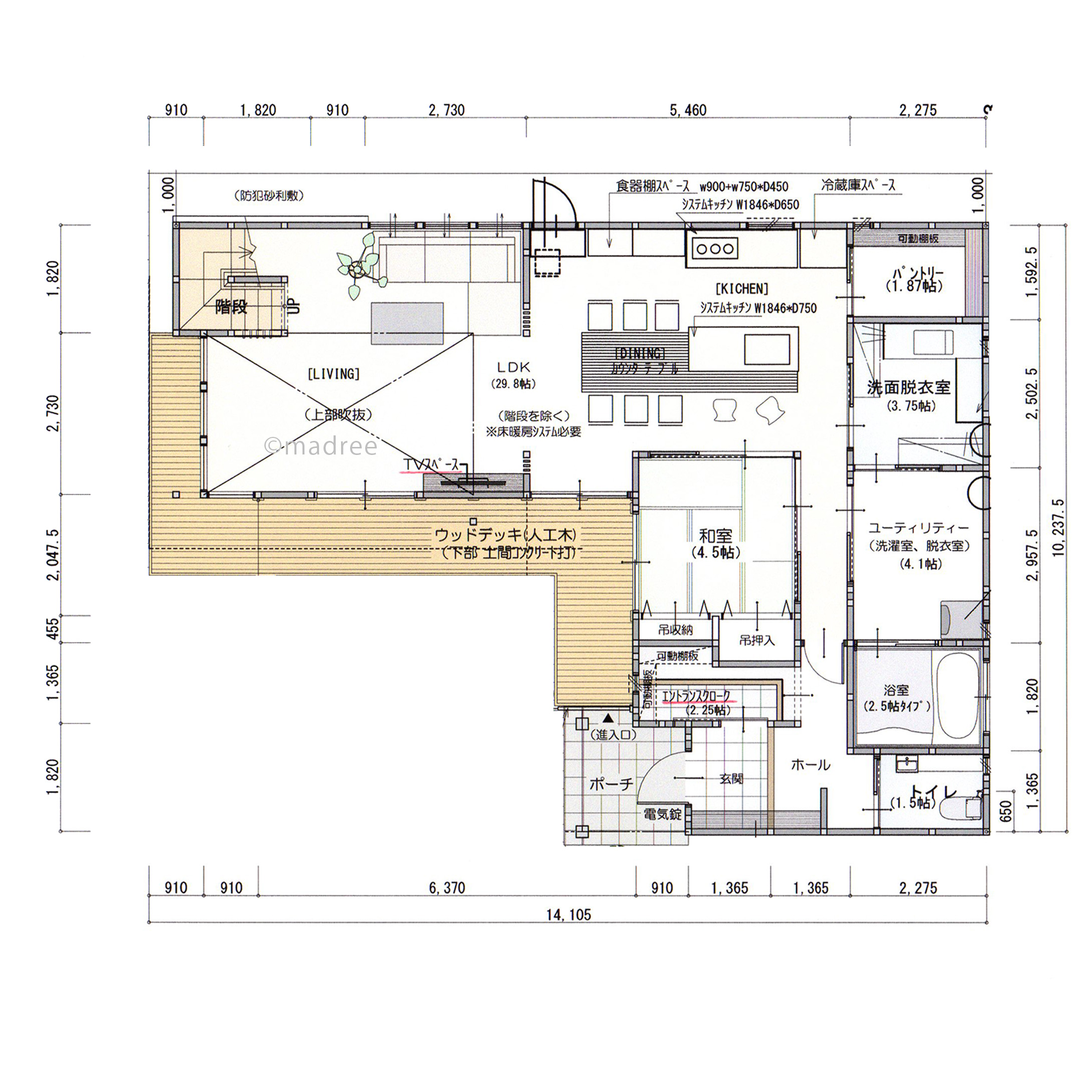 全国の建築家から間取りが集まるmadree(マドリー)で集まった54坪、3LDKの間取りです。オープンキッチンやⅡ型キッチンが特徴の注文住宅の間取りです。