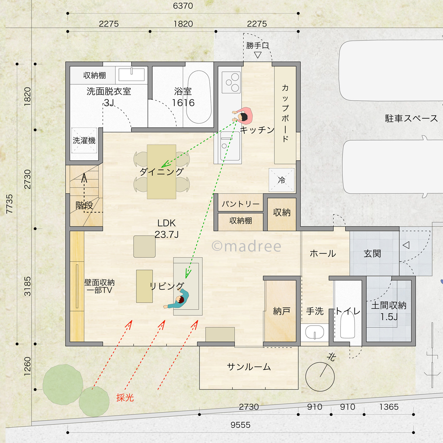 ・サンルームはリビングの採光を妨げず日当りの良い位置に配置しました