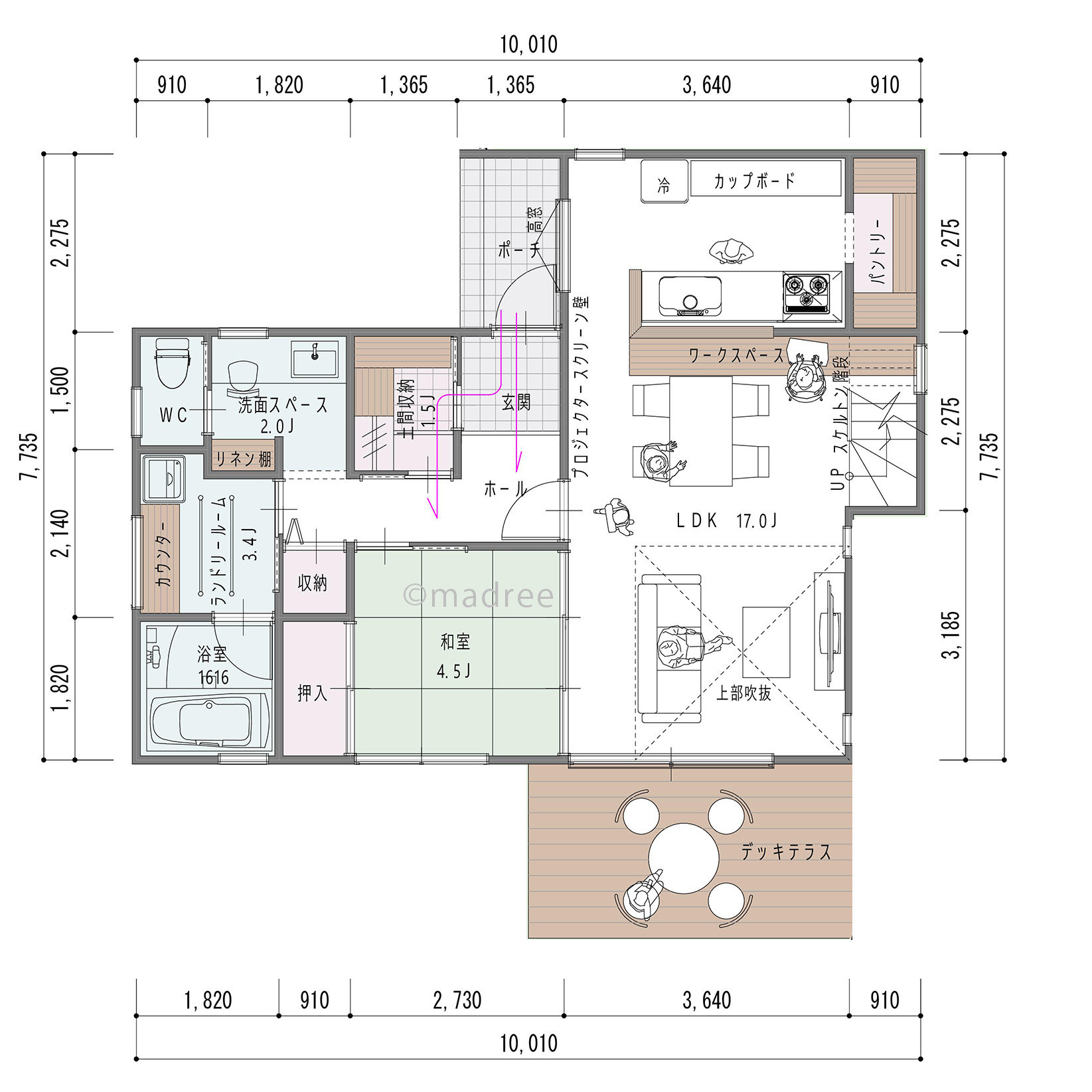 全国の建築家から間取りが集まるmadree(マドリー)で集まった35坪、4LDKの間取りです。オープンキッチンやペニンシュラキッチンが特徴の注文住宅の間取りです。