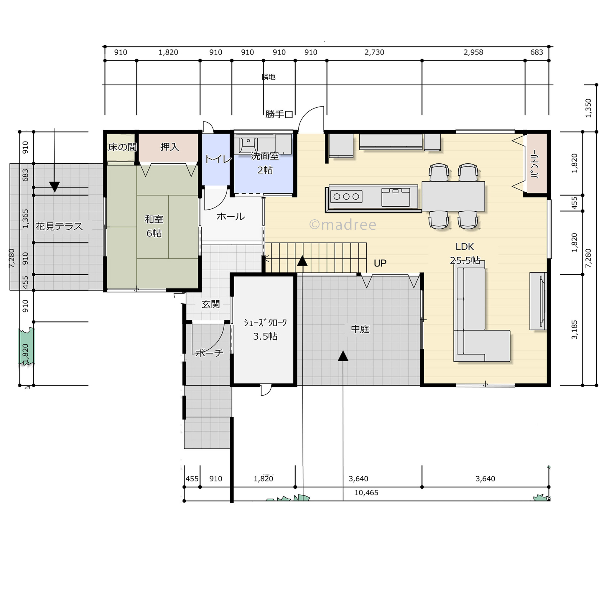 ・スケルトン階段を中心に配置するとこで1,2階の関係、外部中庭との関係が把握し易い。