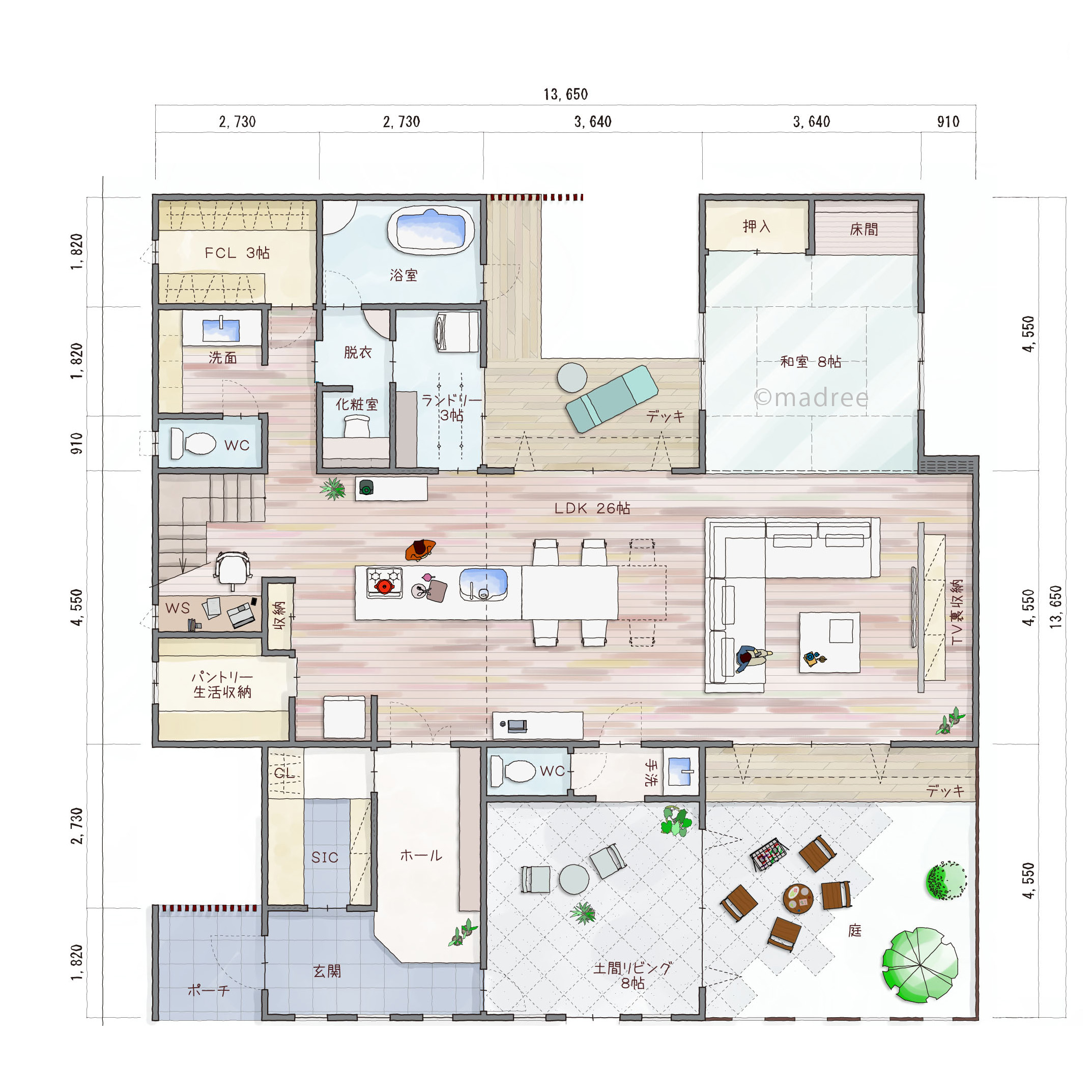 [58坪 3LDK] 余白ある空間が心にゆとりもたらす、ゲストをお迎えする土間リビングのある家の間取り