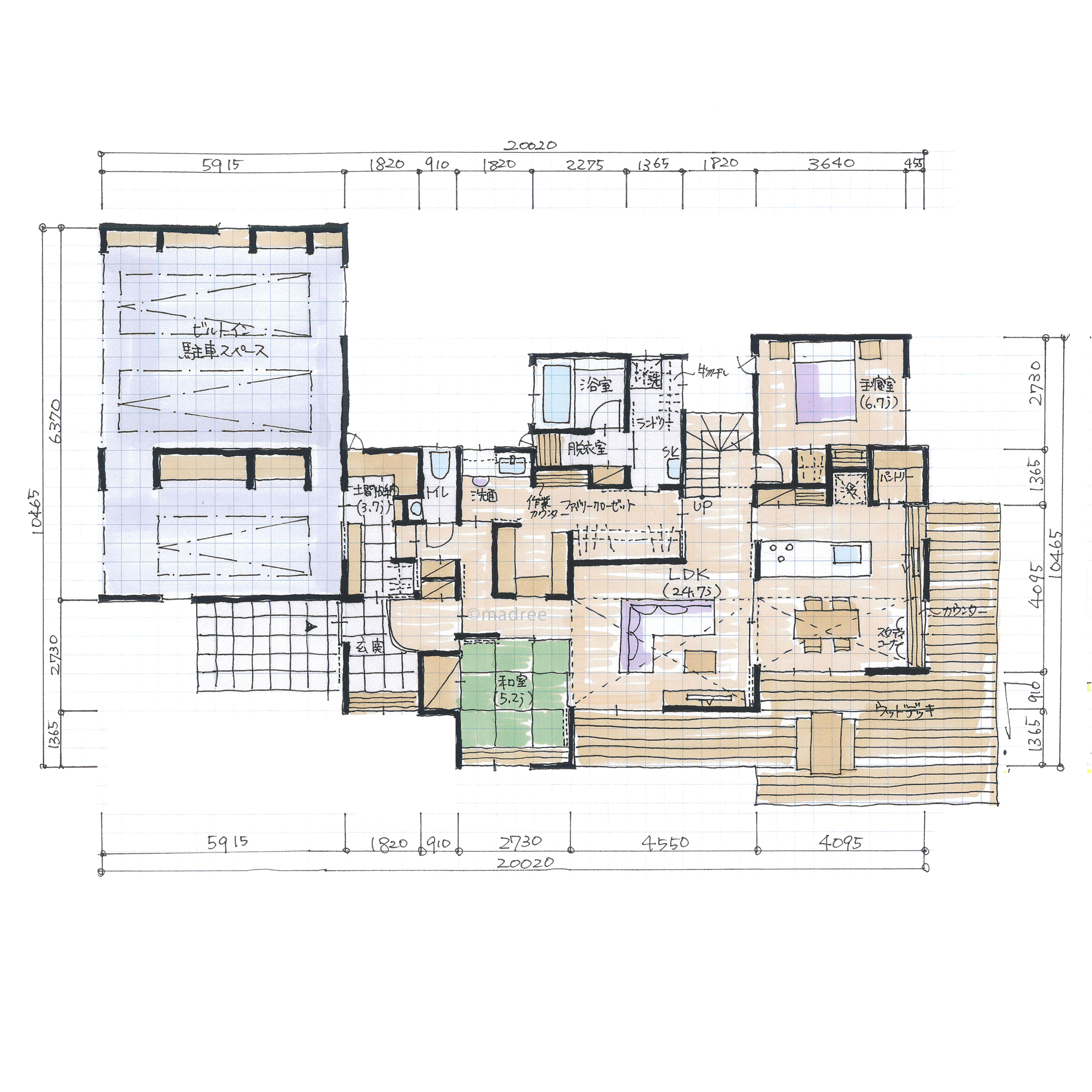 全国の建築家から間取りが集まるmadree(マドリー)で集まった44坪、4LDKの間取りです。オープンキッチンやペニンシュラキッチンが特徴の注文住宅の間取りです。