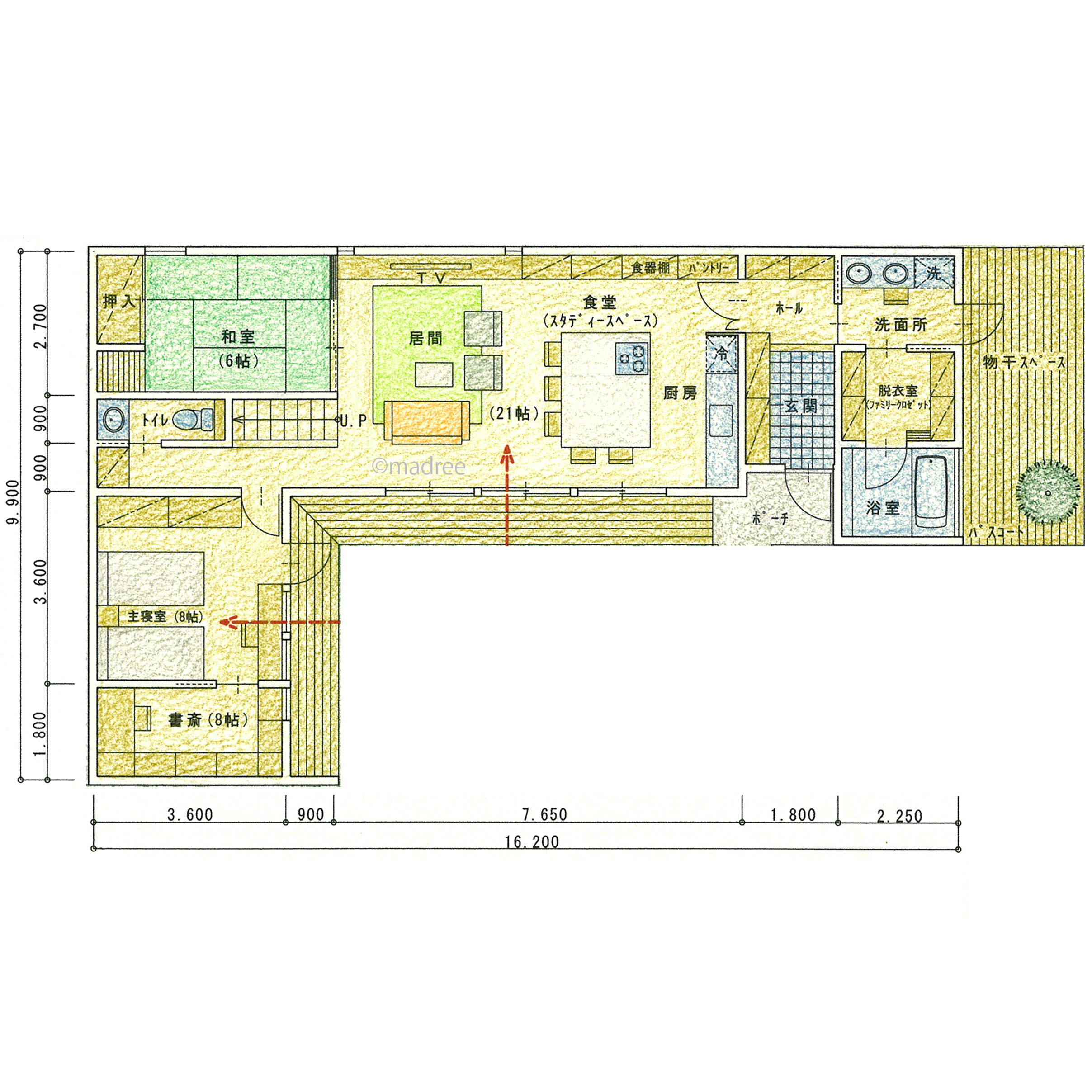 全国の建築家から間取りが集まるmadree(マドリー)で集まった39坪、6LDKの間取りです。オープンキッチンやⅡ型キッチンが特徴の注文住宅の間取りです。