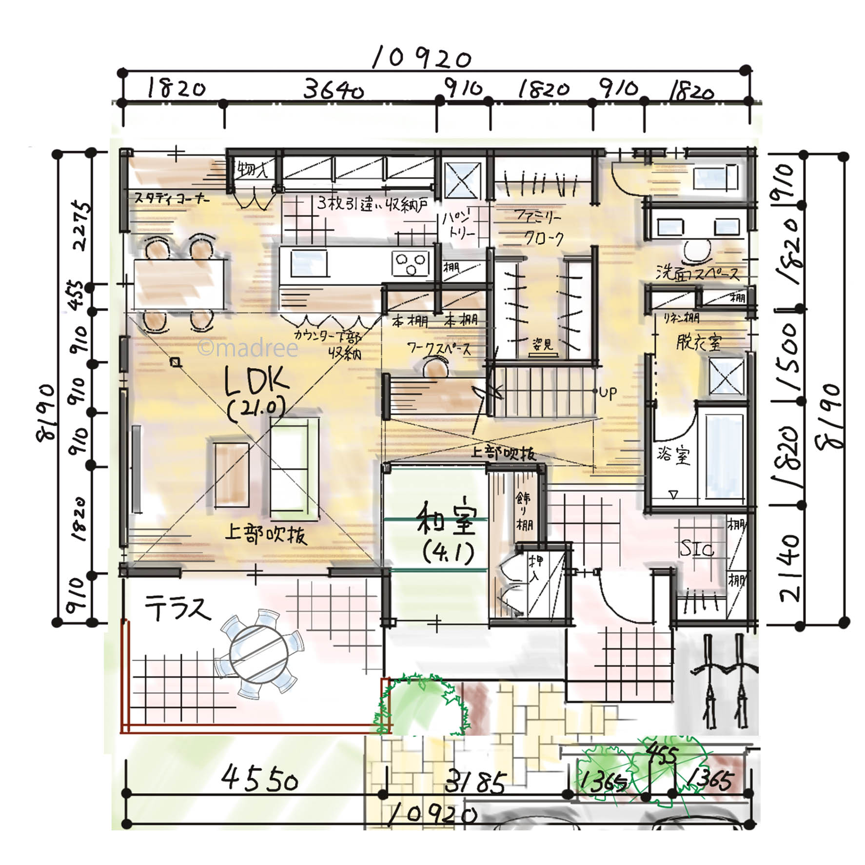 ・2階建の場合、バルコニーは必要ないとの事でしたので、 お洗濯も1階で干す事を前提に計画しています。 その為ファミリークロークも1階に設けている次第です。