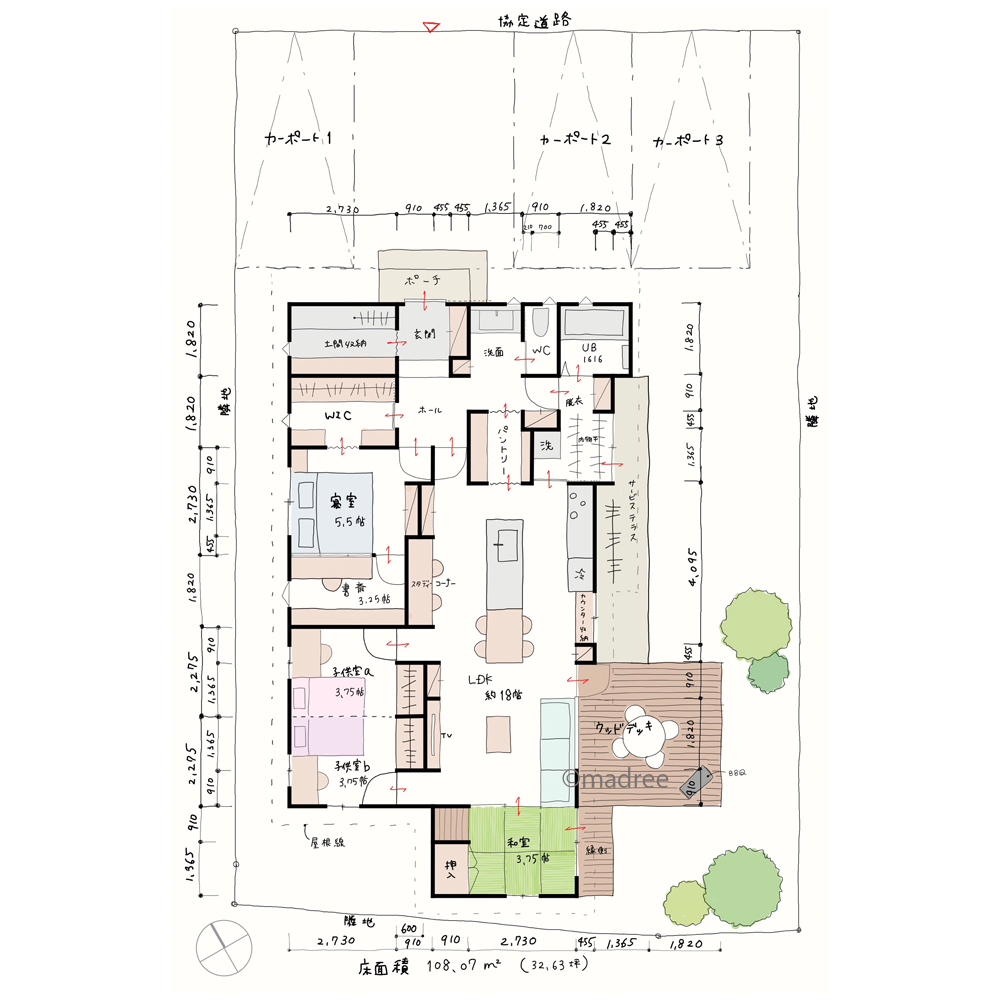 全国の建築家から間取りが集まるmadree(マドリー)で集まった33坪、3LDKの間取りです。外とつながるLDKやアウトドアリビングが特徴の注文住宅の間取りです。