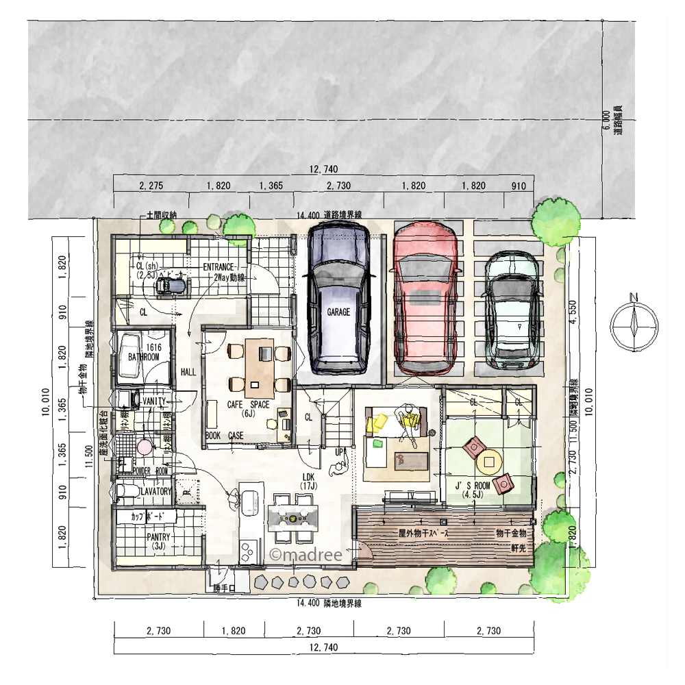 ・建築面積の関係上車庫は1台を屋根付きに致しました。